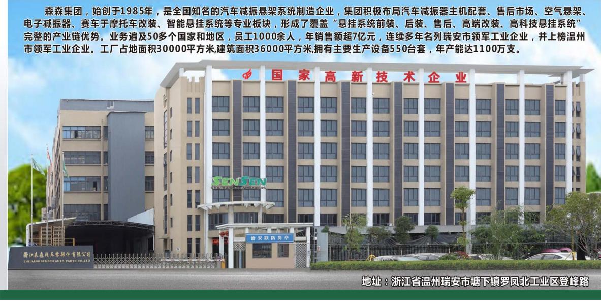 森森集团,始创于1985年,是全国知名的汽车减震悬架系统制造企业,集团积极布局汽车减振器主机配套、售后市场、空气悬架、电子减振器、赛车与摩托车改装、智能悬挂系统等专业板块,形成了覆盖“悬挂系统前装,后装、售后、高端改装、高科技悬挂系统”完整的产业链优势。业务遍及50多个国家和地区,员工1000余人,年销售额超7亿元,公司研发中心系浙江省级技术研发中心,中心拥有工程技术人员100人;其中高级工程师3名,中级工程师15名;研发中心集产品设计、测试、认可、样件制造和实车调试为一体,为保证向顾客提供优质产品提供支持。连续多年名列瑞安市领军工业企业,并上榜温州市领军军工业企业。工厂占地面积30000平方米,建筑面积36000平方米,拥有主要生产设备550台套,年产能达1100万支。